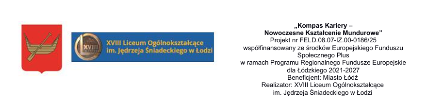 Celem projektu jest podniesienie jakości i dostępności kształcenia ogólnego w XVIII LO w Łodzi poprzez wdrożenie kompleksowego programu wsparcia rozwoju kompetencji kluczowych, psychospołecznych i zawodowych uczniów i uczennic szkoły oraz podniesienie kwalifikacji zawodowych nauczycieli w okresie od 01.02.2026 do 31.05.2027. Projekt w szczególności odpowiada na potrzeby wyrównywania szans edukacyjnych, wsparcia dobrostanu psychicznego oraz przygotowania uczniów i nauczycieli do wyzwań współczesnego rynku pracy.